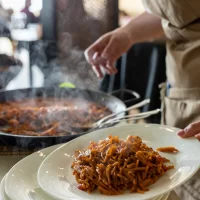 Jamón ibérico 100% bellota, selección de quesos españoles, carnes a la brasa, pescados de lonja, mariscos recién traidos, arroces, tartas, postres, todo casero.